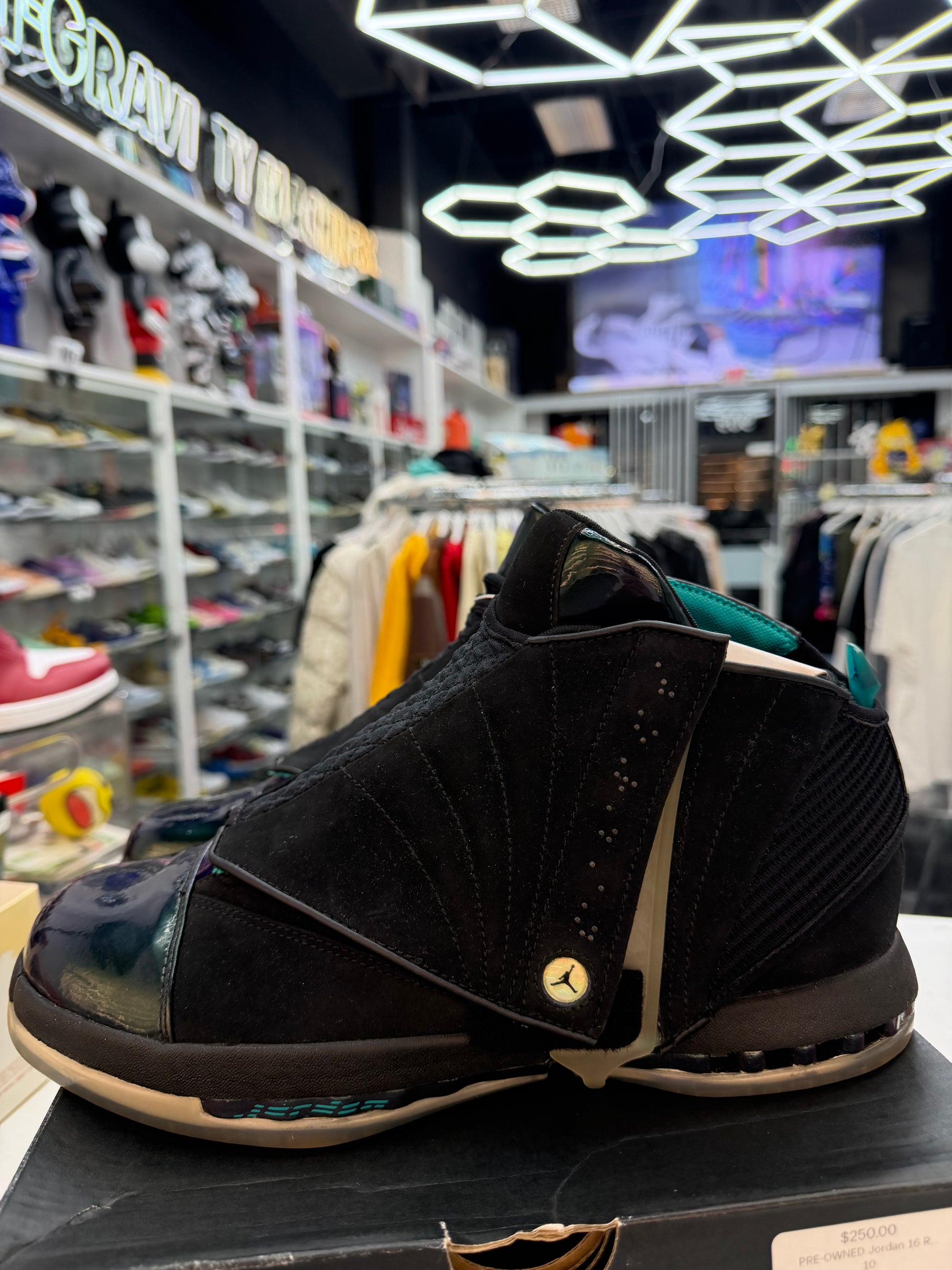 This Air Jordan 16 Retro is known as the "CEO" edition. Inspired by Michael Jordan and his title as a majority owner and CEO of the Charlotte Hornets franchise. They come in a Hornets-themed black, metallic silver and turbo green colorway. Sporting a black-based suede upper with iridescent hits on the tongue and toe. Turbo green detailing and a full icy translucent outsole finish things off. Their release date was October 20th, 2017 where they were available at select Jordan Brand retailers worldwide. Limited to 2,300 pairs,