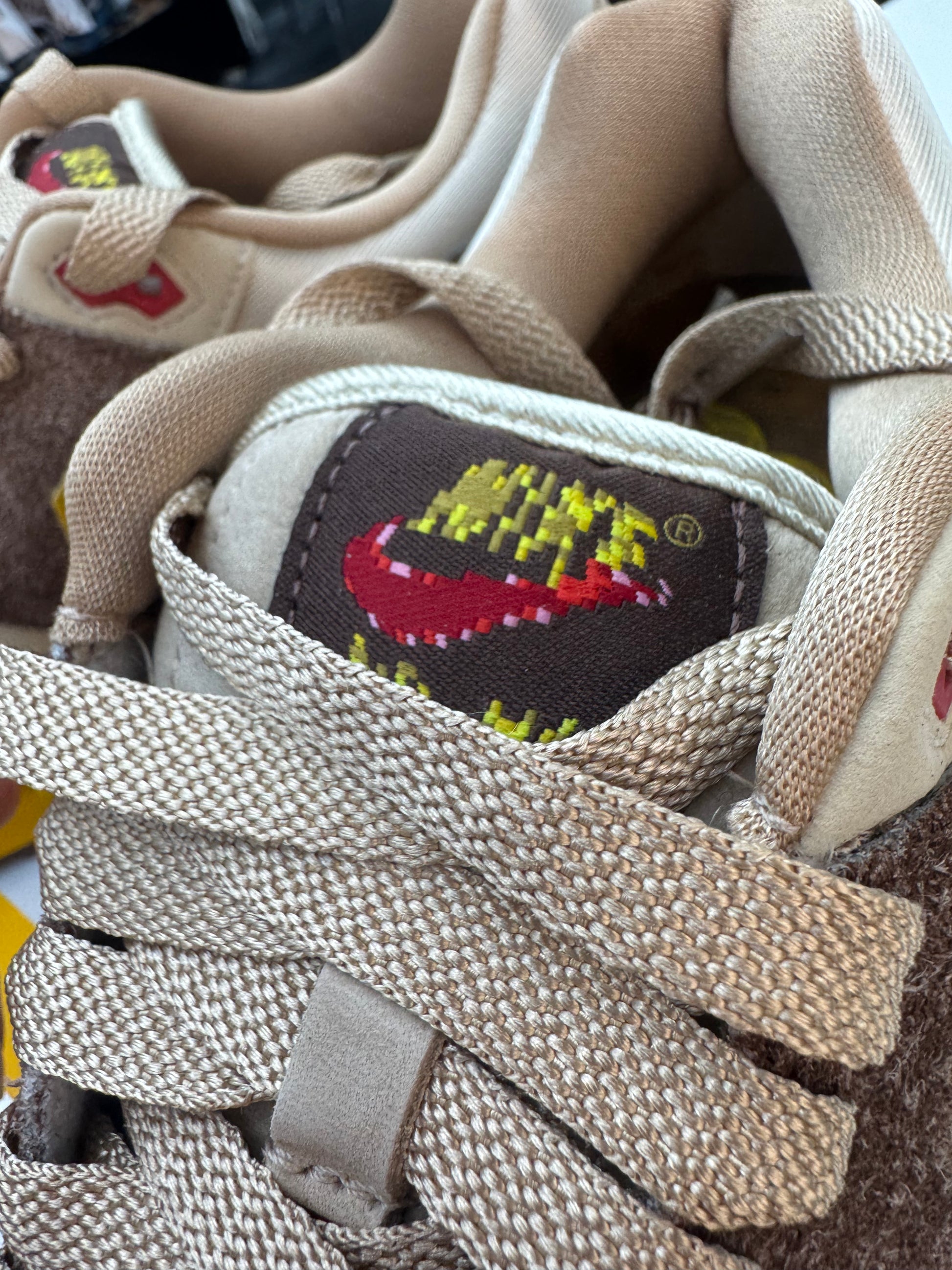 The Nike Air Max 1 .SWOOSH Low Poly Big Head Origins channels retro gaming nostalgia with a design inspired by pixelated aesthetics. Its upper mixes light chocolate, hemp, and sand drift hues, highlighted by a bold university red Swoosh that looks pulled straight from an old-school video game. Low-resolution graphics on the tongue and insole nod to classic 16-bit visuals, while subtle details throughout pay tribute to the legendary Donkey Kong Country.