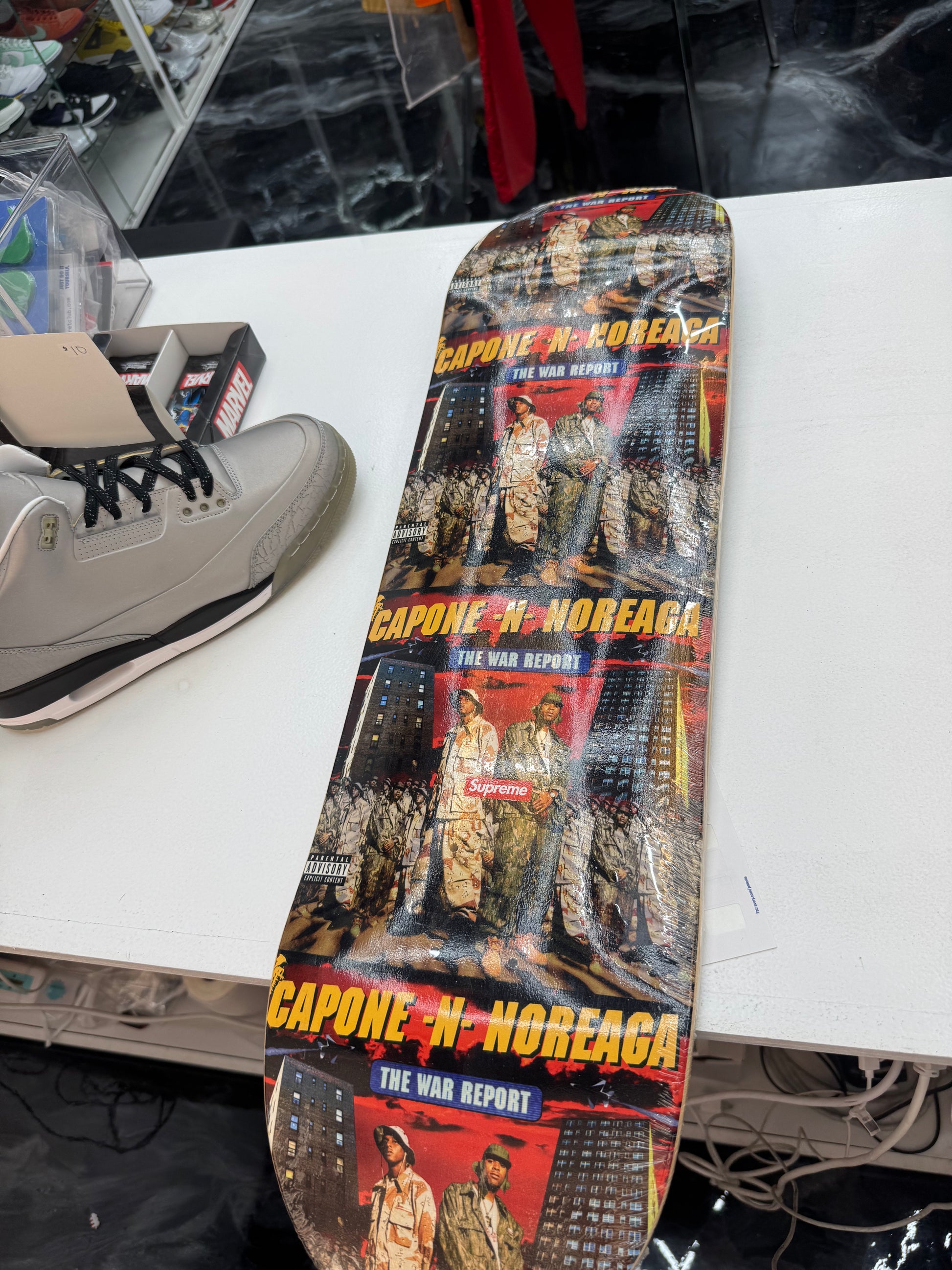 Considered a classic among New Yorkers and hip-hop fans in general, The War Report by CNN released in 1997. Hailed as ahead of its time both stylistically and lyrically, it's no surprise that Supreme's tipped its hat to the iconic album in their Fall/Winter 2016 collection. While not an official collaboration, the album cover appeared on t-shirts, shorts, and skateboards. This deck features a repeating all-over print of the album's cover,